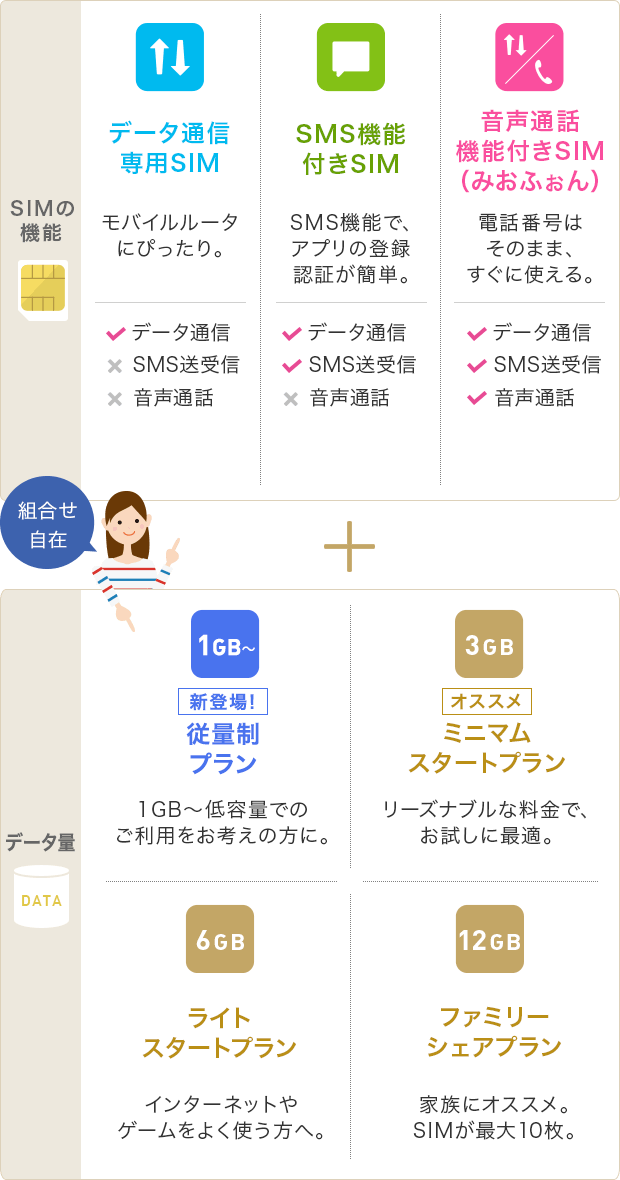 あなたの使い方にあったデータ量や機能を自由に組み合わせることができてとってもお得!