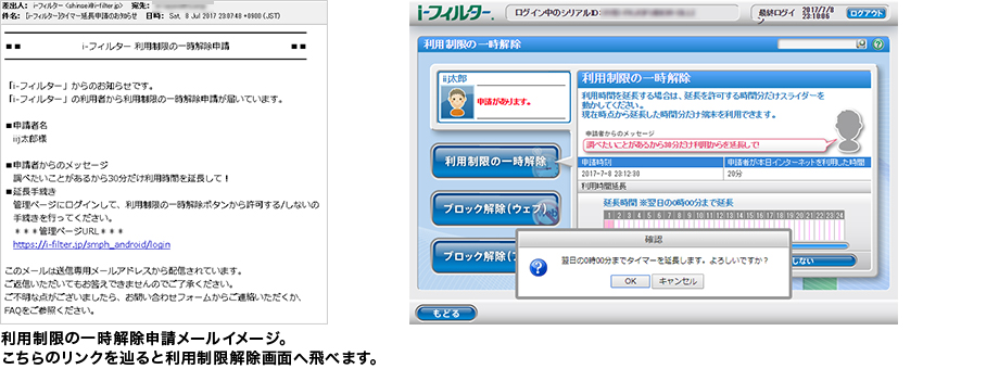 状況に合わせて利用制限の一時解除も。さらに、心強い機能も満載