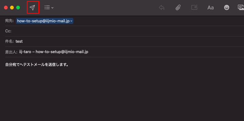 - ・宛先:送り先の電子メールアドレスを入力(例:how-to-setup@iijmio-mail.jp)