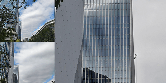 超解像を標榜するarrows Alphaで、下記写真左上→左下→右と徐々に望遠倍率を上げて遠くのビルを撮影しました。