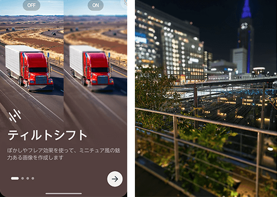 また、撮影した風景がミニチュアのようになる「ティルトシフト」機能が利用可能ですので、暗所撮影性能を生かして夜間のティルトシフト撮影も楽しめます。