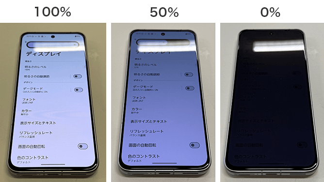 明るい室内照明の直下における、ディスプレイ輝度100%、50%、0%の状態です。実際に使う場面では、100%だと眩しいほどです。