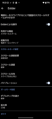 電源ボタンに長く触ると画面中央右にExliderが立ち上がり、電源ボタンの上で指を下にスライドすると表示画面が下にスクロール、上にスライドすると上にスクロールします。