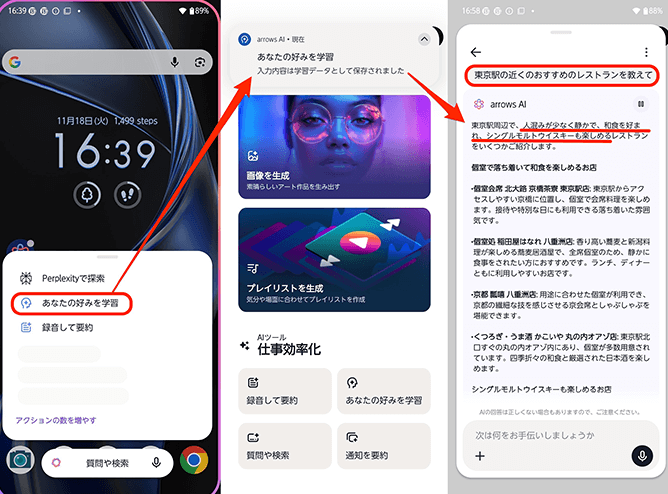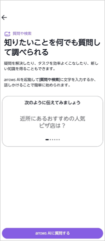 arrows AIを起動後、「Perplexityで検索」機能を利用することで、音声または文字入力から目的の情報を簡単に検索できます。