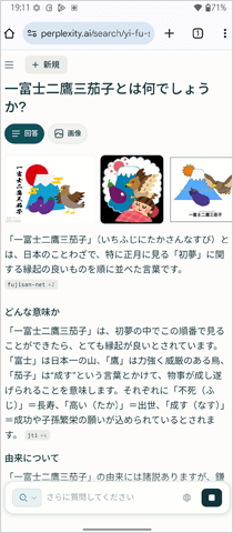 下記の例では、「一富士二鷹三茄子とは何でしょうか?」という質問に対して、その意味だけでなく由来まで丁寧に要約してくれています。