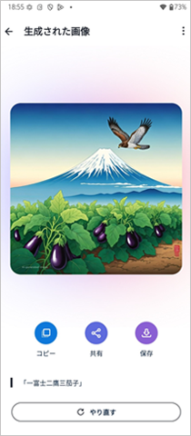 下記の例では、「一富士二鷹三茄子」の画像を生成するよう指示した結果を示しています。