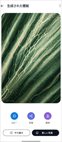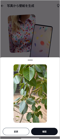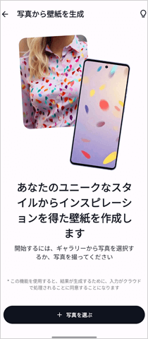 一方、「写真から壁紙を生成」は、撮影した写真をそのまま壁紙サイズに加工するのではなく、写真の印象や構図からAIが最適なデザインを生成します。
