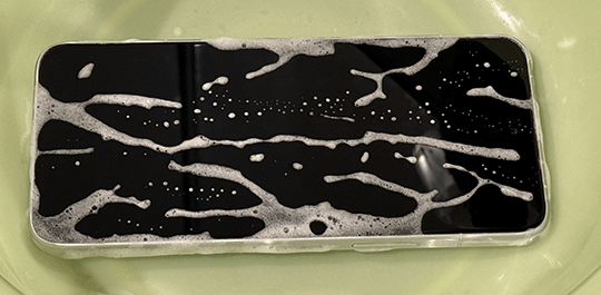 泡タイプのハンドソープをarrows Alphaの正面と裏面につけ、洗浄してみました。