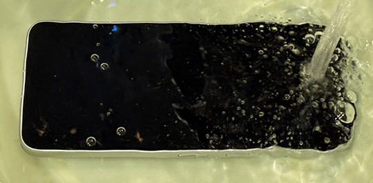 洗浄後は、arrows Alphaを水道水ですすぎます。公式ページの説明通り、受話口、セカンドマイク、底面の送話口やUSB端子周辺などは念入りに水道水ですすぎます。
