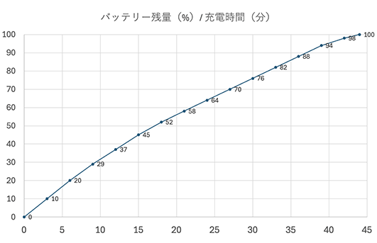 急速充電に対応しているスマートフォンでも、バッテリー残量100%に近づくと充電速度が低下する(バッテリー残量の増加が緩やかになる)モデルが多く見受けられますが、arrows Alphaは90%を超えてもそれまでとほぼ同じ速度で充電されました。