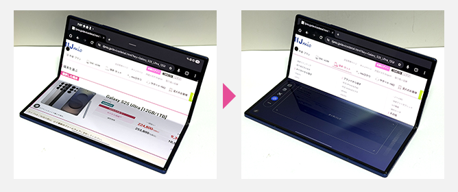 一方、メインディスプレイでは、完全に展開した際の(一般的な)全画面表示に加え、本体をラップトップPCのように折りたたんで使用する際はフレックスモードパネルを表示させることもできます。