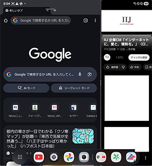 Galaxy Z Fold7では、メインディスプレイを完全に展開した状態で2つのアプリを左右に並べて使うこともできます。アプリは左右もしくは上下に並べて表示でき、表示幅も調整可能です。