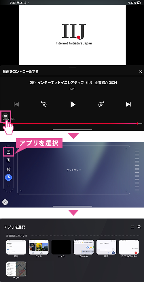 90度に折りたたんだ際に下側になるディスプレイに、フレックスモードの設定アイコン(下記画像水色の丸印)が表示されます。「アプリを選択」を選ぶと、最近使用したアプリ一覧が表示され、選択することで下側画面にそのアプリを表示させることが可能です。