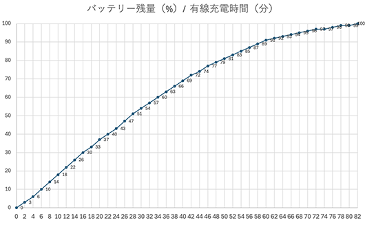 Galaxy Z Fold7に最大出力45Wの充電器を接続し、バッテリー残量0%から100%になるまで有線充電を行うのに要した時間は、82分(1時間22分)でした。